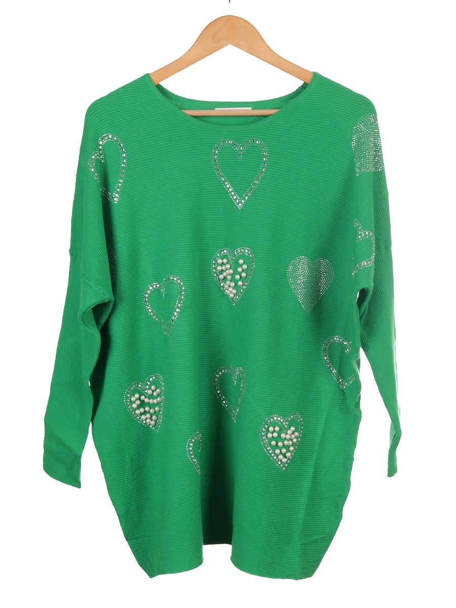 Elevate your knitwear collection with this green ribbed jumper featuring delicate pearl and diamante heart details. Crafted for both comfort and style, its textured fabric offers a flattering fit while the subtle embellishments add a refined, feminine touch. Perfect for layering or wearing on its own, this jumper combines classic design with expert detailing to enhance your everyday wardrobe.