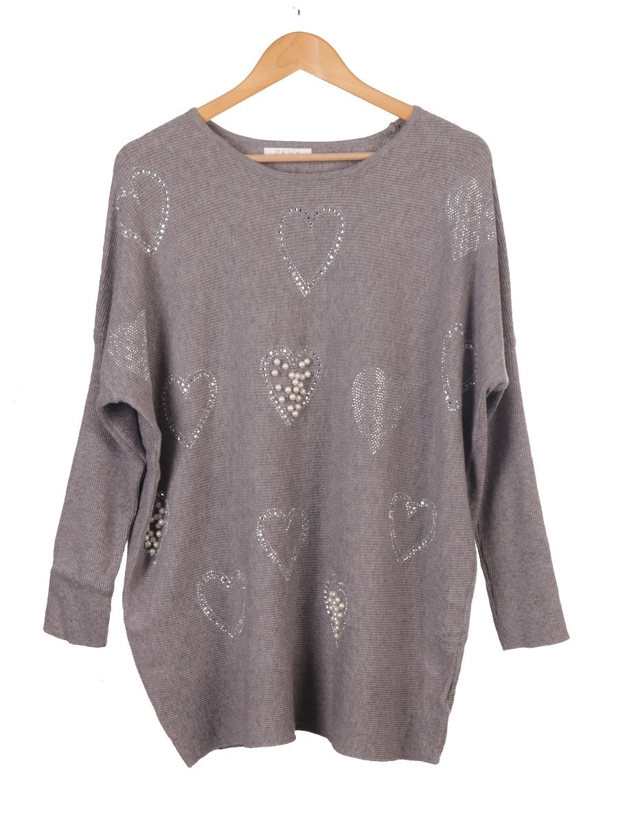 Pearl And Diamante Hearts Detail Ribbed Knitted Jumper - Grey